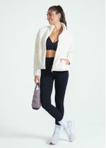 O casaco é todo feito com tecido sintético texturizado, oferecendo muito conforto.