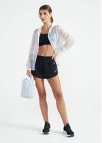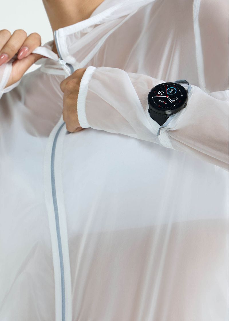 Esta jaqueta corta-vento feita 100% em tecido de poliamida tem fecho éclair frontal refletivo com cursor personalizado e ventilação nas axilas. Possui também abertura na manga esquerda e na manga direita para visualização do relógio, capuz com detalhe refletivo e bolso traseiro com Logo refletivo.